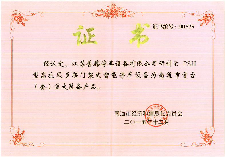 近日,江蘇普騰自主研制的“PSH型高抗風(fēng)多聯(lián)門架式智能停車設(shè)備”被南通市經(jīng)濟(jì)和信息化委員會(huì)認(rèn)定為“南通市首臺(tái)(套)重大裝備產(chǎn)品”,充分體現(xiàn)了公司在自主產(chǎn)品研發(fā)道路上的不斷取得突破。